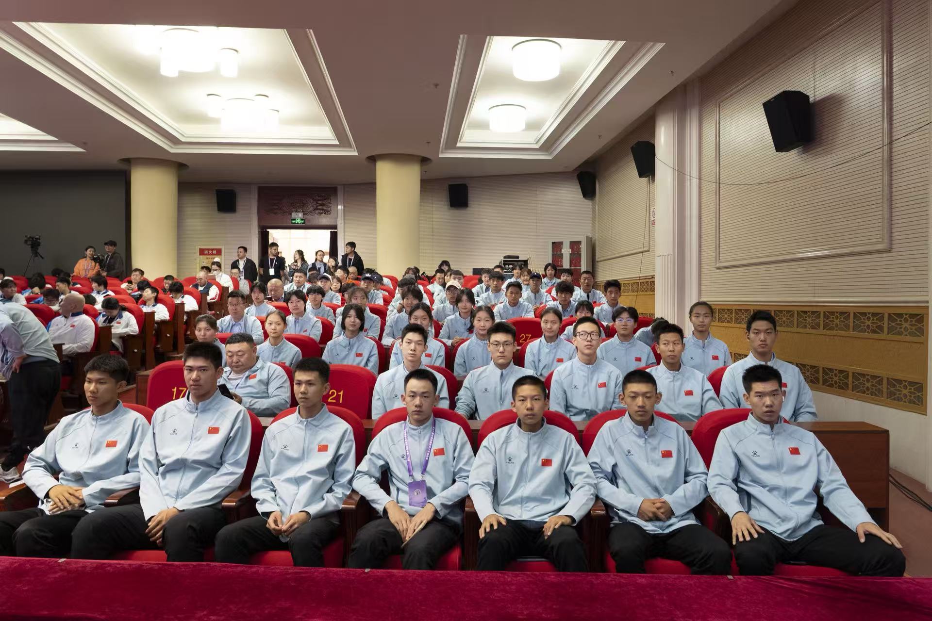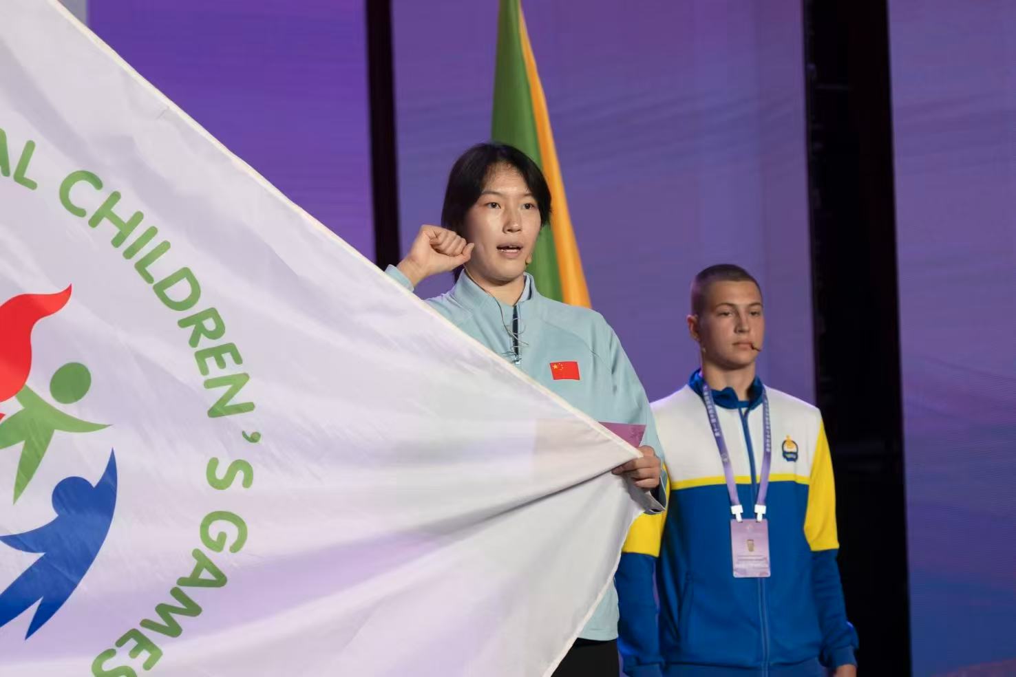 我校女排代表中国参加第十一届中俄蒙国际青少年运动会,我校女排队员赵熙代表所有中俄蒙运动员宣誓。